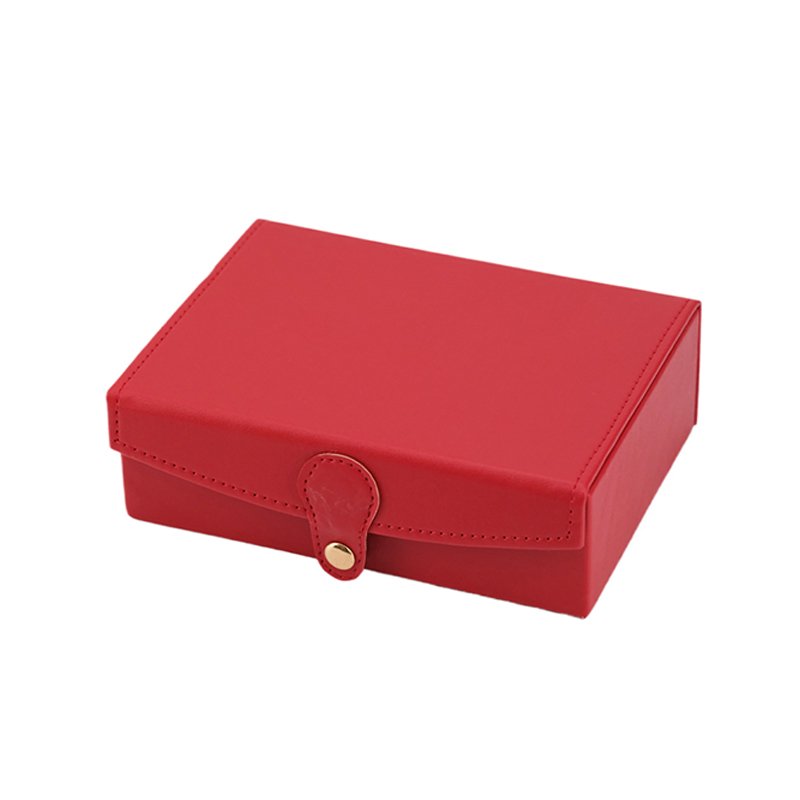 - ★Classic Rectangular Shape & Premium Leather Texture: This jewelry box features a classic rectangular design, covered in bright red smooth faux leather (PU Leather), offering a fine texture and vibrant appeal. The front of the lid is secured by a round leather-accented gold snap/magnetic closure, providing a safe and elegant way to open and close. Its clean lines and overall festive look make it a standout desktop accessory.