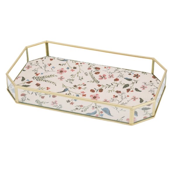 Rectangular Glass Tray with Gold Metal Frame and Floral Base, Decorative Fruit Tray, Elegant TV Trays for Living Room and Dining