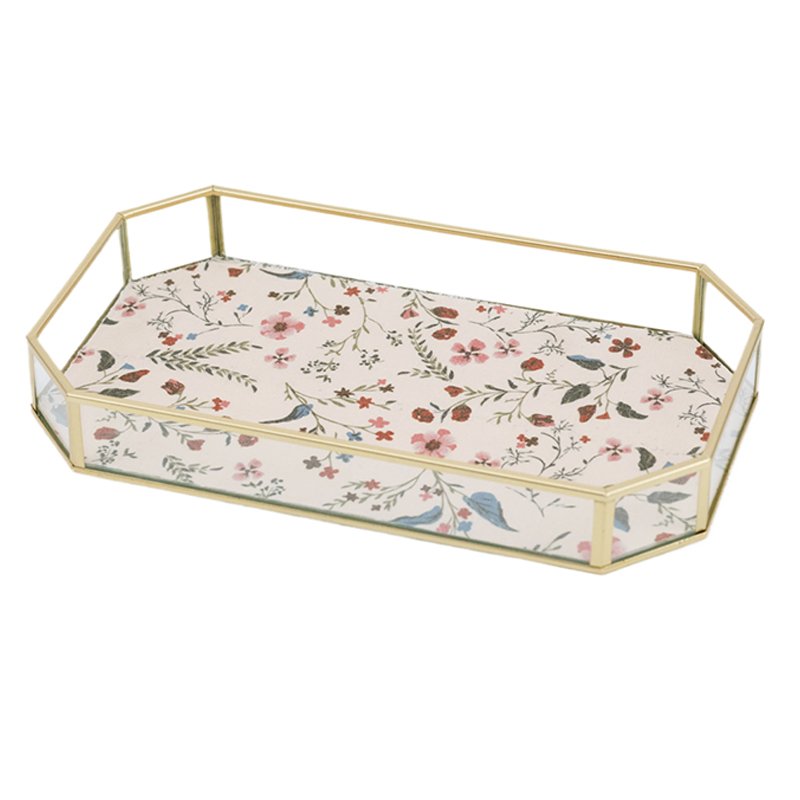Home - HOME DECOR - Tray - Rectangular Glass Tray with Gold Metal Frame and Floral Base, Decorative Fruit Tray, Elegant TV Trays for Living Room and Dining