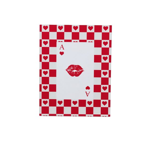 - ★Unique Red and White Checkered Pattern with Poker Theme: This photo frame features a striking red and white checkered pattern border, with alternating small red hearts embedded in the checks, exuding a lively, romantic feel. The central design is an Ace of Hearts playing card featuring a vivid red lip print, showcasing a highly creative and individual style. The entire structure utilizes a glass panel for a sleek, high-gloss finish.