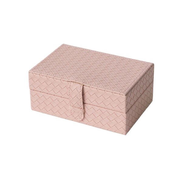 • Sophisticated Pink Woven Texture & Sturdy Silhouette- This PU jewelry box exudes modern luxury with its soft, delicate dusty rose pink tone and a surface covered in a striking 3D cross-woven texture. It features a classic rectangular silhouette with clean, sharp edges, complemented by a wide matching buckle on the front that provides secure storage while adding a fashionable flair reminiscent of high-end leather goods.