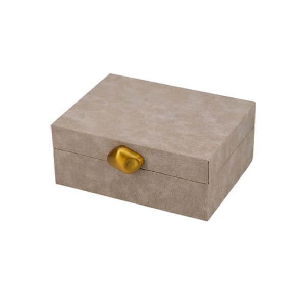 small-sized Beige Suede-Look Jewelry Box with Polished Gold Petal Latch — Medium Decorative Jewelry Storage Box, Elegant Small Jewelry Box for Necklaces and Trinkets, Ideal Girls Jewelry Box Gift