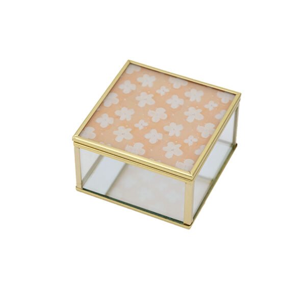 Small Square Glass Jewelry Box with Floral Pink Top and Gold Metal Frame, Elegant Decorative Storage Box for Girls Jewelry Box Collection