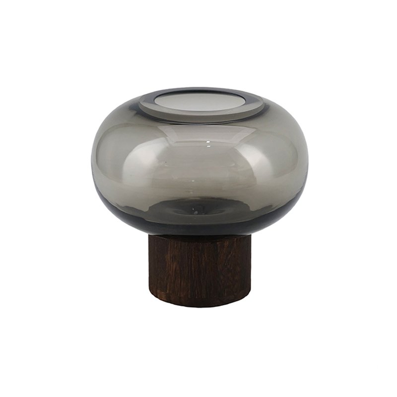 Smoky Gray Glass Vase with Wooden Base, Round Modern Shop Spring Vase, Stylish Decorative Flower Vase for Home, Table, and Office Décor
