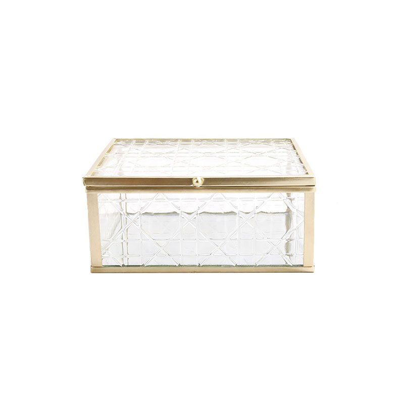 - ★This elegant glass jewelry box features a classic square structure, with its edges perfectly defined by a polished gold-toned metal frame, exuding vintage luxury. The most striking feature is its unique cane or diamond-patterned textured glass panelson both the lid and all four sides, which clearly showcase a refined geometric pattern, adding diffused beauty and rich visual layers to the transparent glass. A small, delicate sphere-shaped clasp is positioned on the front to ensure the lid closes securely. The entire design cleverly blends functionality with artistry, making it an exceptionally stylish jewelry box.